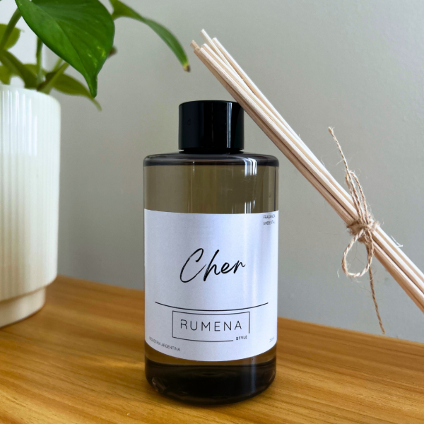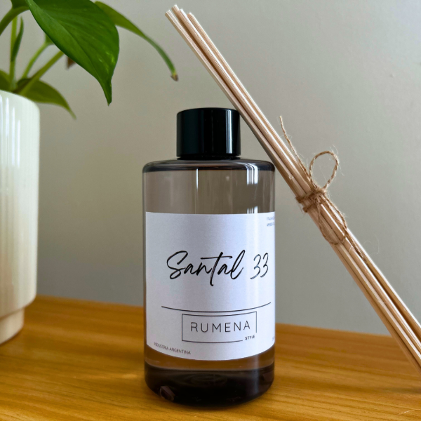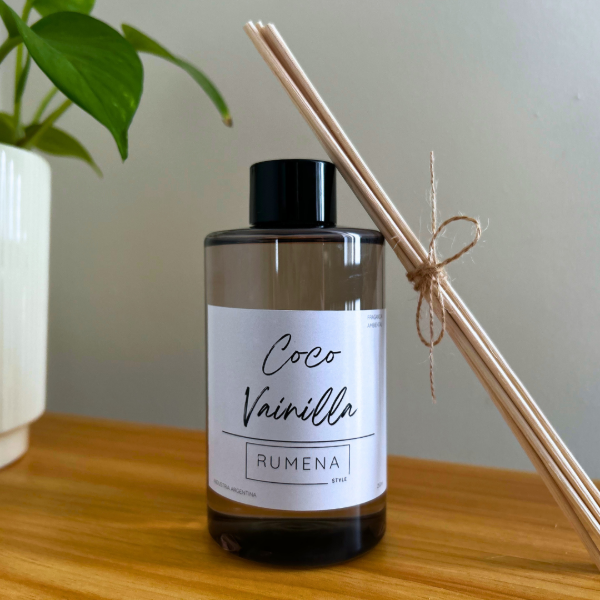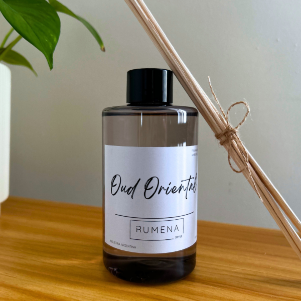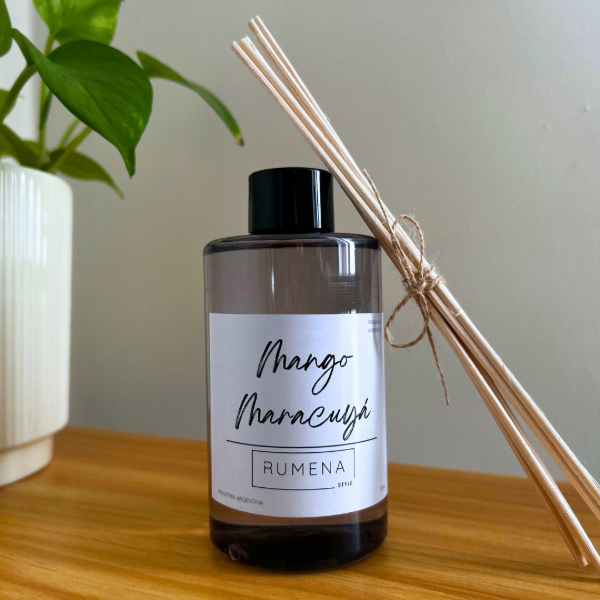 Presentación en envase de plástico ámbar con varillas de ratán.